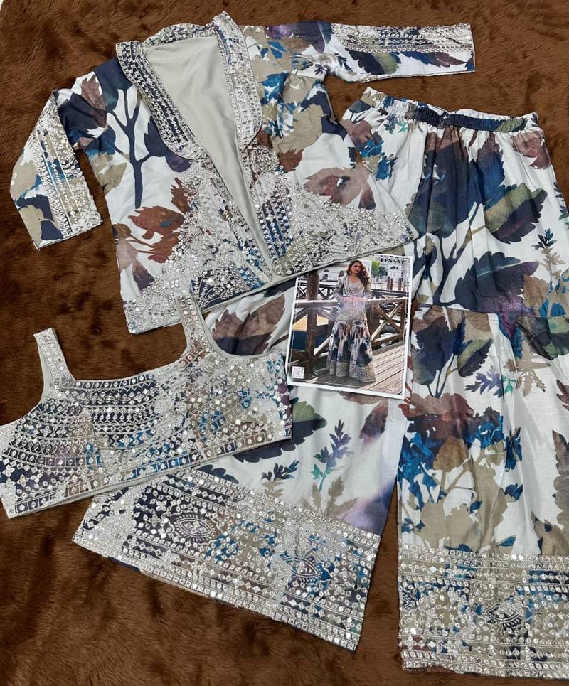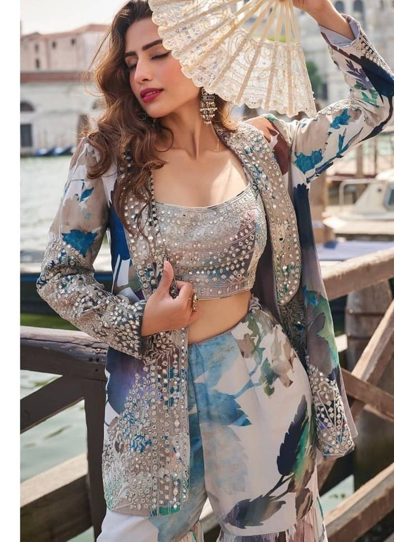 Blue chinon silk indowestern crop top, gharara and shrug set free size full stitched upto 42