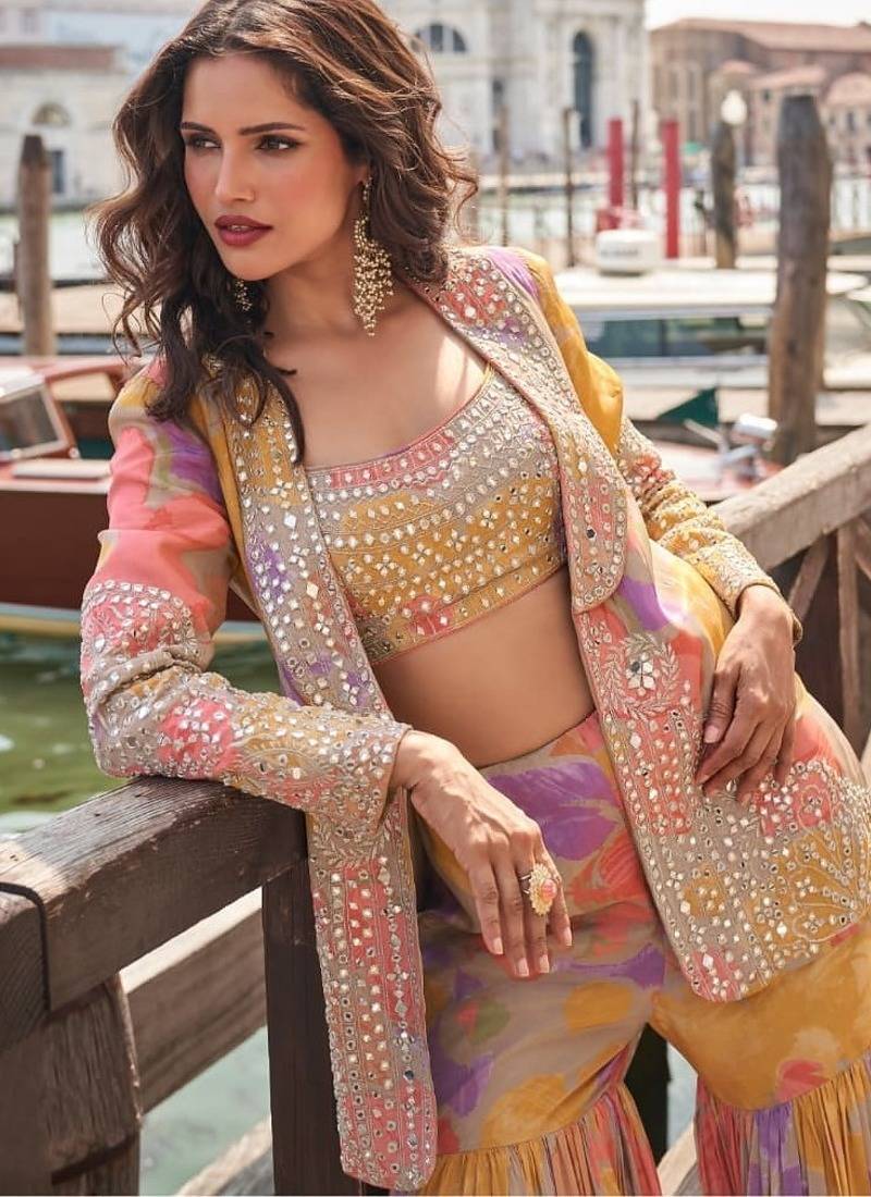 Peach chinon silk indowestern crop top, gharara and shrug set free size full stitched upto 42