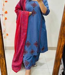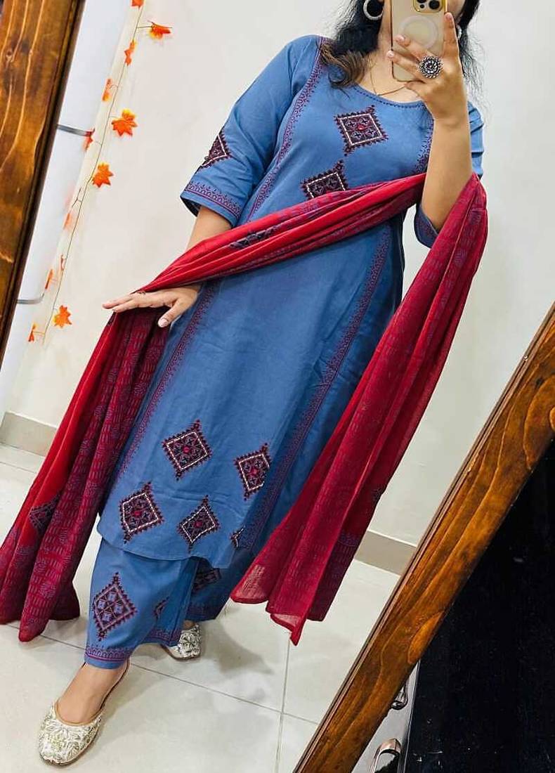 Product Name Floral Embroidered Round Neck Pure Cotton Kurta Trosuer And Dupatta Set