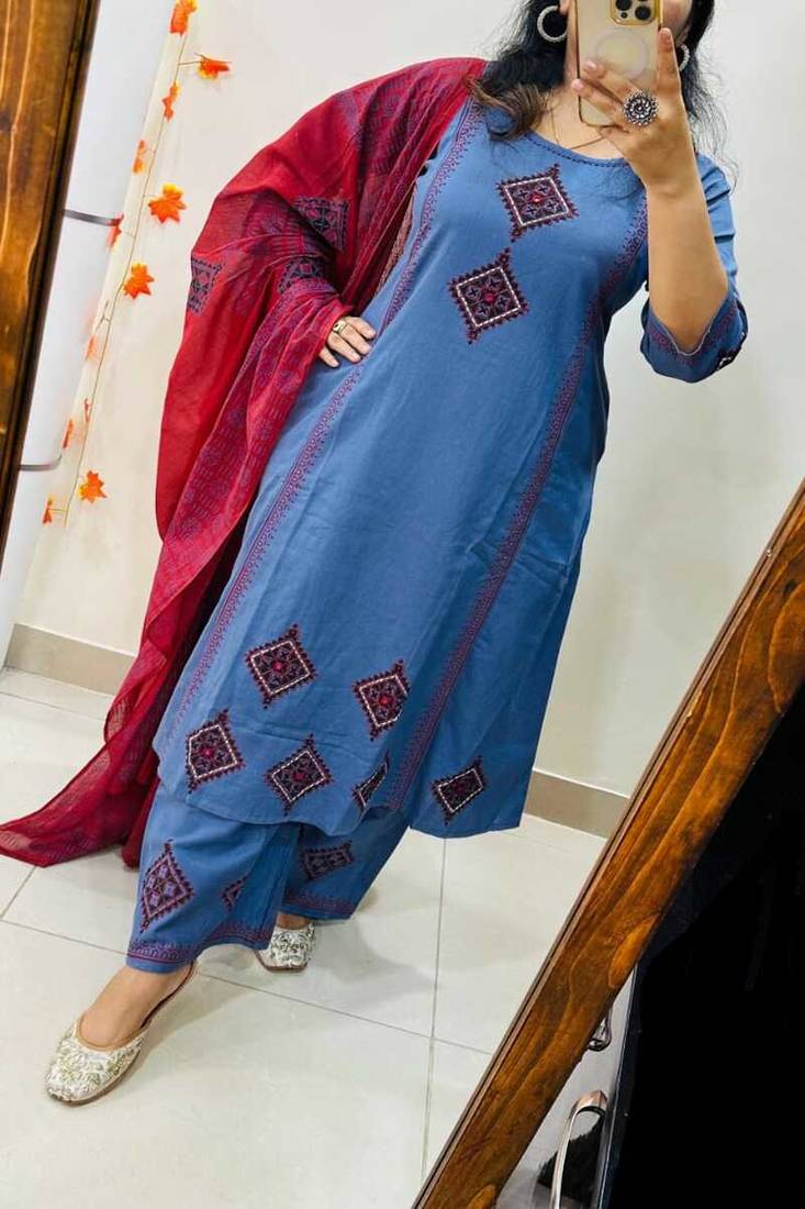 Refresh Your Ethnic Wardrobe With This Graceful Floral Embroidered Round Neck Pure Cotton Kurta Trouser And Dupatta Set. Crafted From Soft And Breathable Pure Cotton Fabric, This Elegant Three Piece Ensemble Features Delicate Floral Embroidery That Adds A Timeless Charm. Designed For Comfort And Style, It Is Perfect For Festive Occasions, Office Wear, Casual Outings, And Daytime Celebrations.
