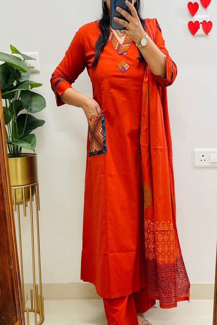 | Product Name | Floral Embroidered V Neck Pure Cotton Kurta Trosuer And Dupatta Set | |