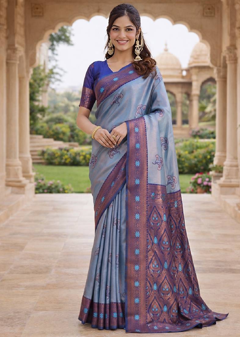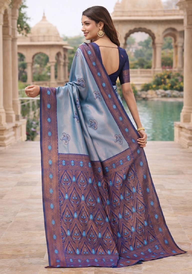 Product Name Blue Rama Silk Blend Jacuard Work Designer Party Wear Saree With Unstitched Blouse Piece