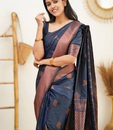 Blue soft art silk banarasi jacuard work designer party wear saree with unstitched blouse piece