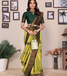 Lemon green soft art silk blend banarasi jacuard work designer party wear saree with unstitched blouse piece