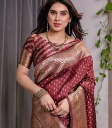 Maroon soft art silk banarasi jacuard work designer party wear saree with unstitched blouse piece