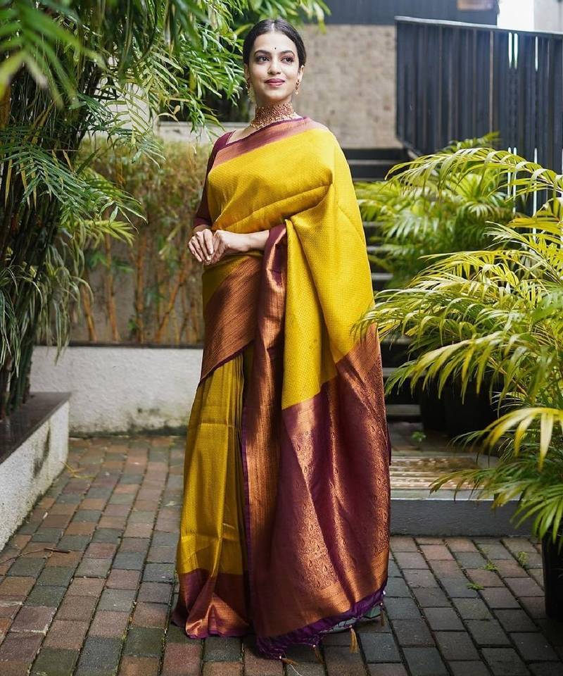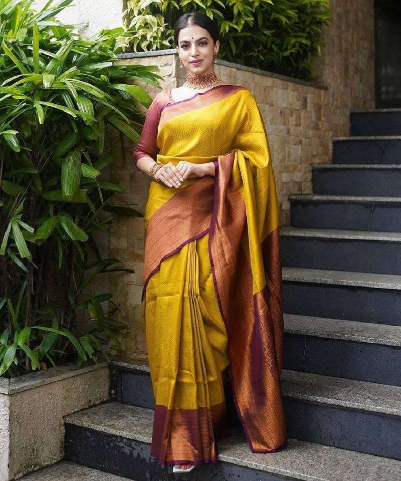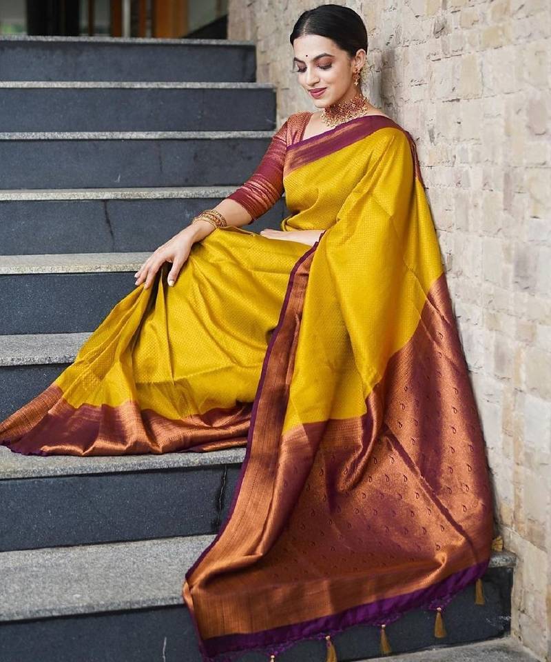 Mustard maroon soft art silk banarasi jacuard work designer party wear saree with unstitched blouse piece