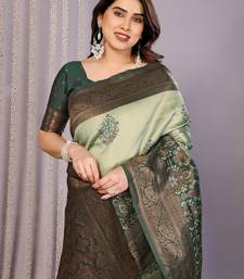 Pista green soft art silk blend banarasi jacuard work designer party wear saree with unstitched blouse piece