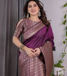 Wine soft art silk banarasi jacuard work designer party wear saree with unstitched blouse piece