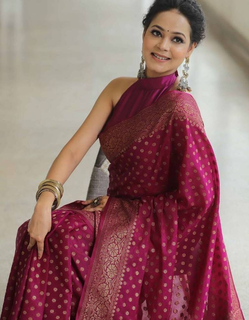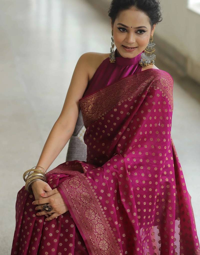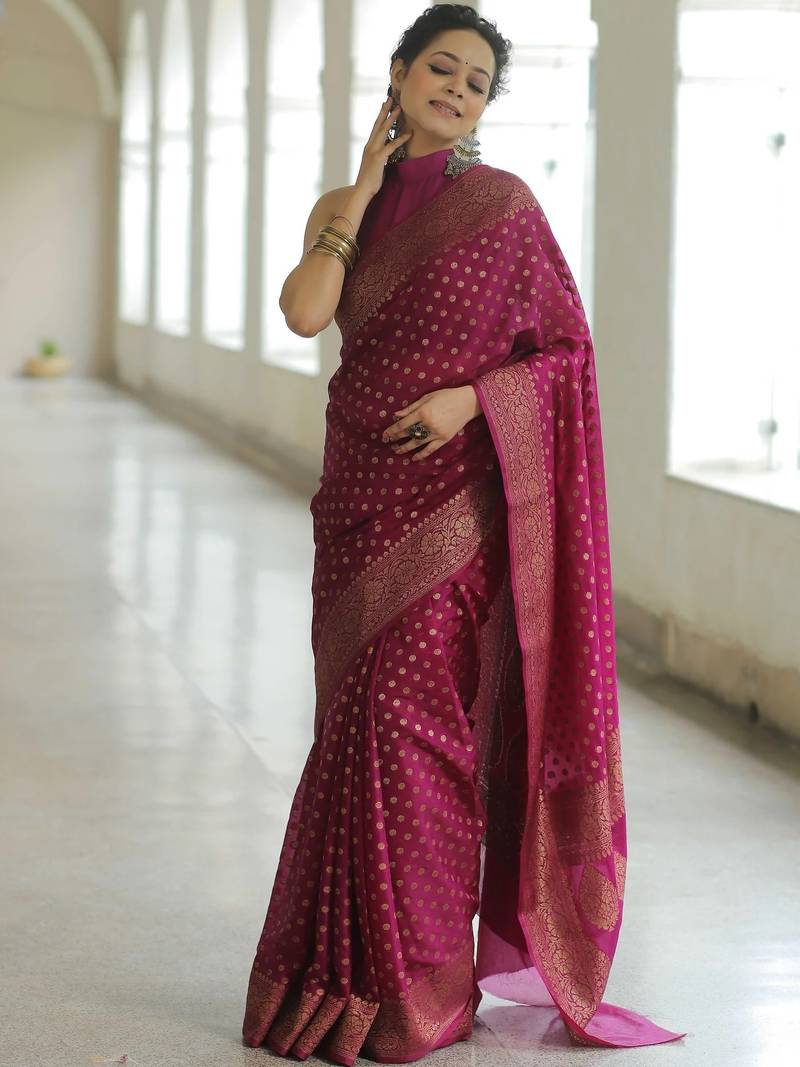 Wine soft art silk banarasi jacuard work designer party wear saree with unstitched blouse piece