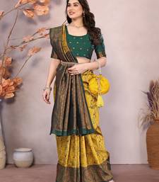 Yellow green soft art silk blend banarasi jacuard work designer party wear saree with unstitched blouse piece