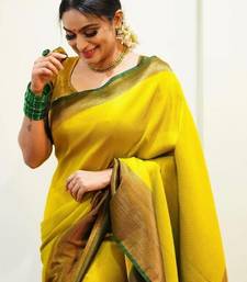 Yellow soft art silk banarasi jacuard work designer party wear saree with unstitched blouse piece