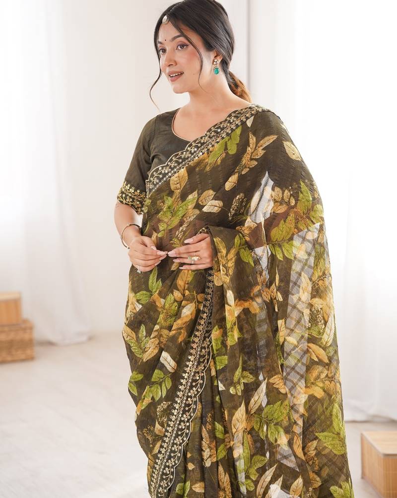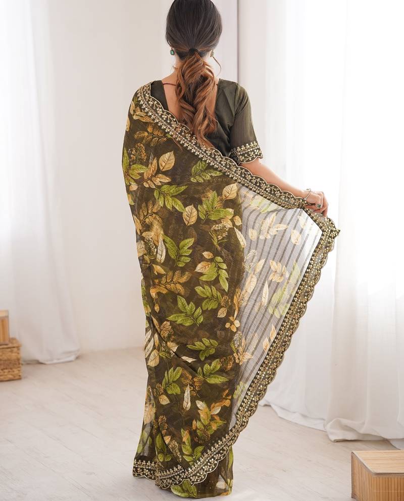 Mehendi heavy marble bright patta saree with flower print & embroidery work | cut work lace border