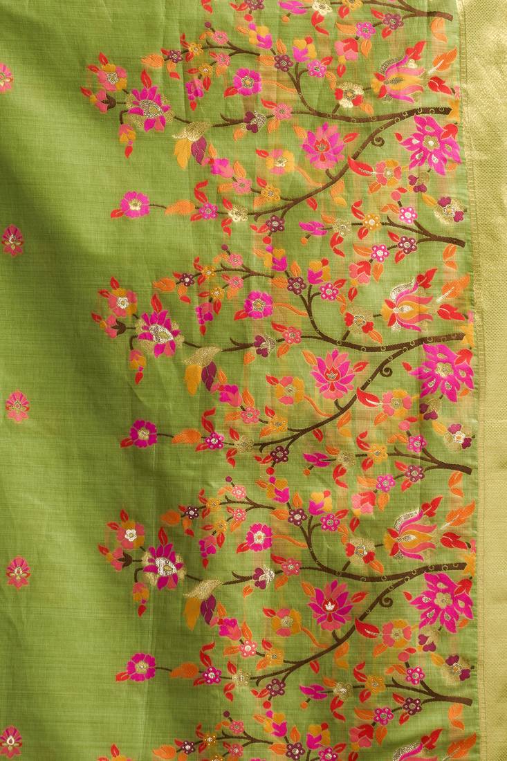 | Product Name | Parrot Green Premium Munga Cotton Mina Work Saree With Zari Border & Pum Pum Lace | |