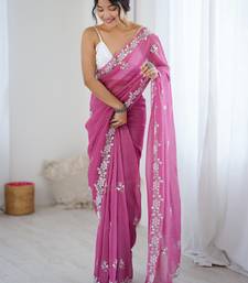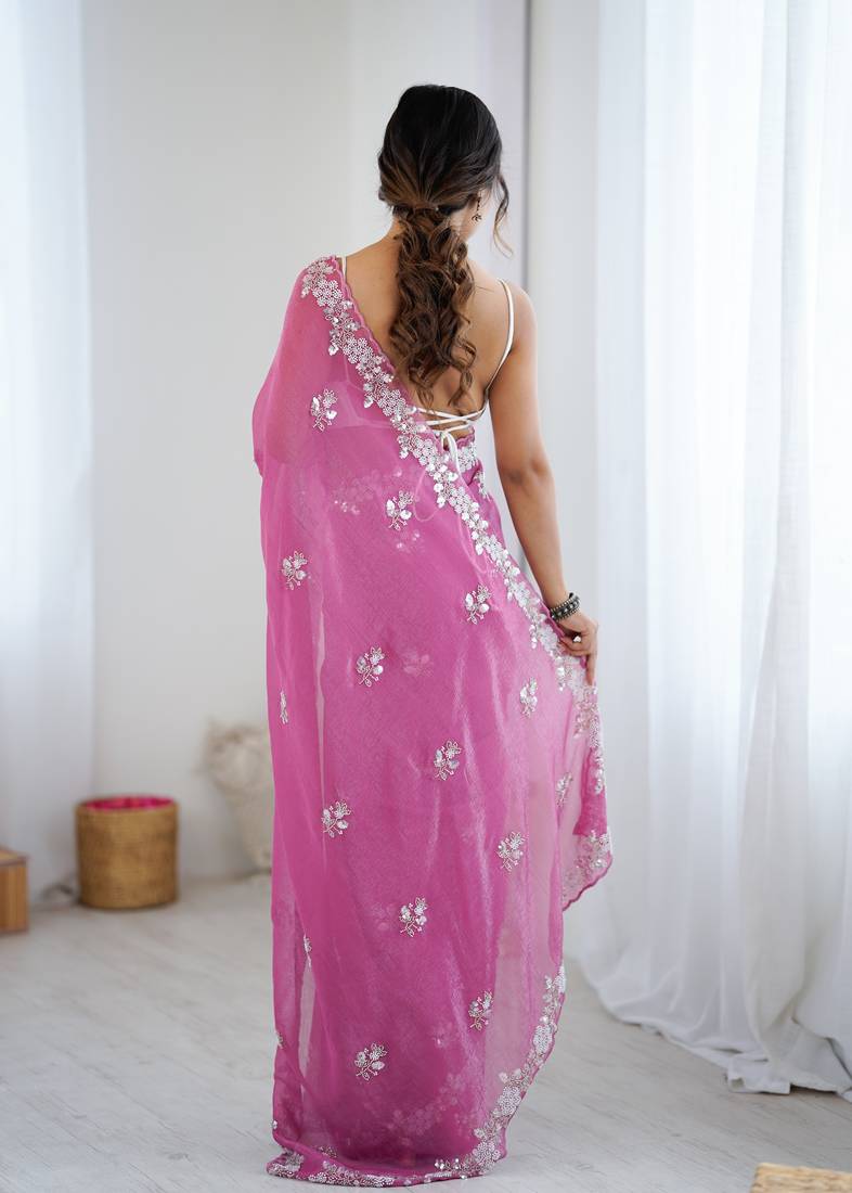 Pink chiffon crush saree with ultra satin blouse – sequins, moti & cut dana work designer party wear saree