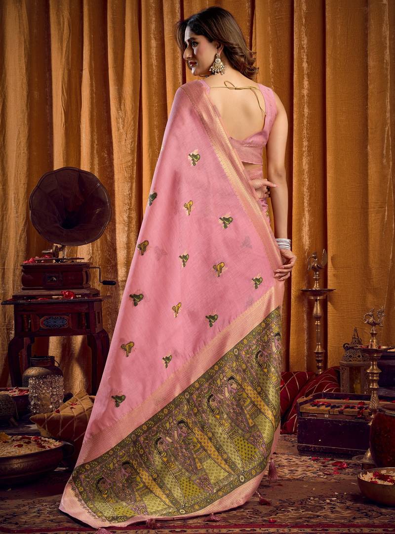 Pink khadi cotton saree with elegant jhallar border & katha work | mina design | rich brocade blouse