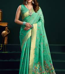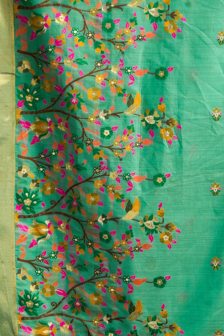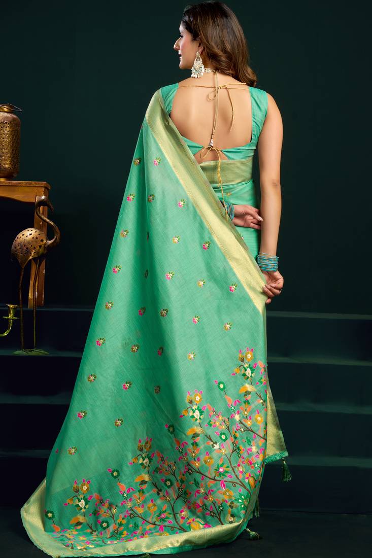 Sea green premium munga cotton mina work saree with zari border & pum pum lace