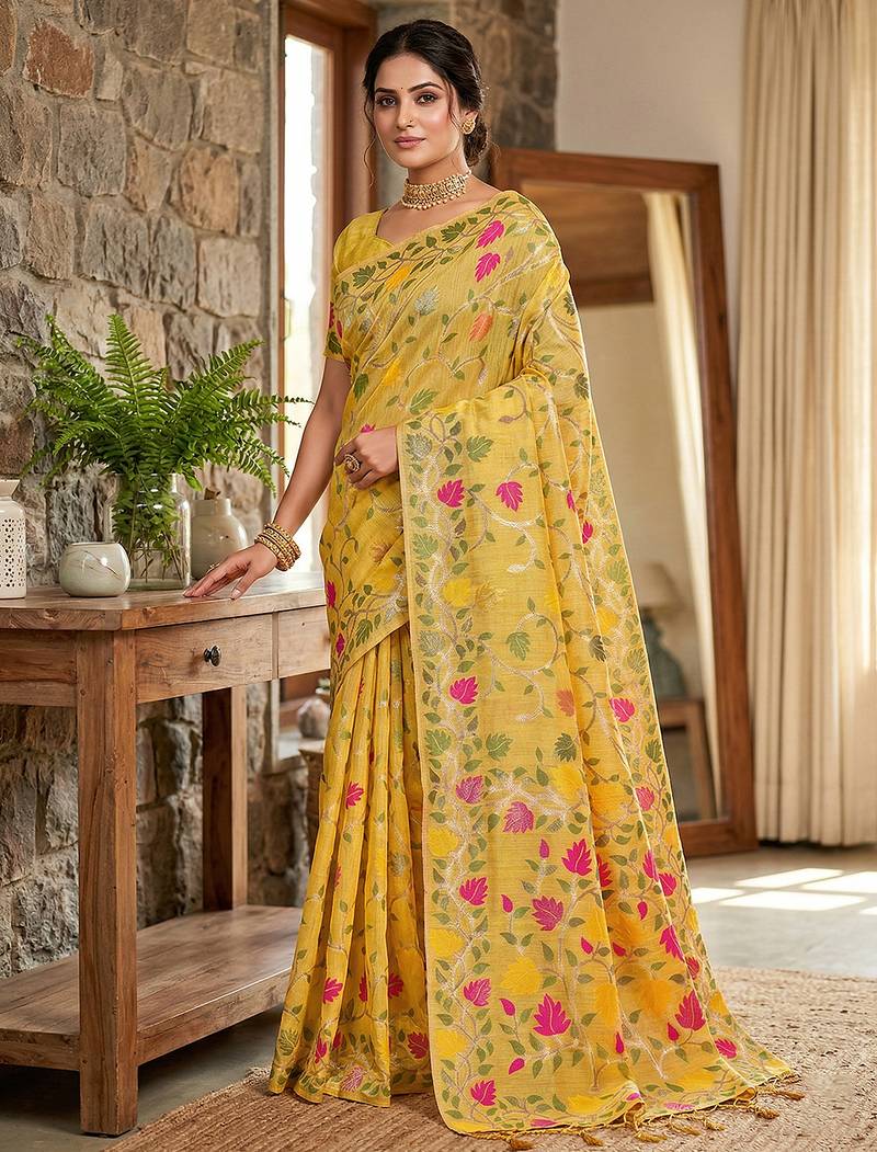 | Product Name | Yellow Elegant Linen Cotton Saree – Lightweight & Comfortable Ethnic Wear | |