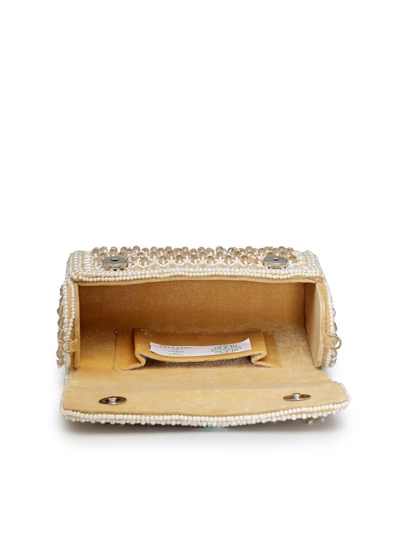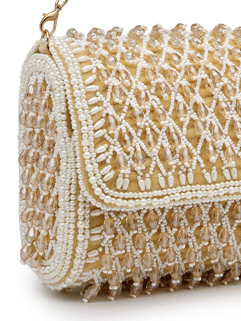 The Anekaant Clutch From The Crystal Cascade Collection Is Designed With A Single Interior Compartment Secured By An Elegant Button Closure, Offering Refined Functionality For Special Occasions. Finished In A Champagne Gold Base, The Design Is Embellished With Ivory And Crystal Toned Beadwork For A Luminous, Sophisticated Appeal. Crafted In Rich Velvet Fabric And Complemented By A Matching Suede Lining, The Clutch Delivers A Plush, Premium Feel. The Exterior Features An Elegant Lattice Pattern, Enhanced With Pearl And Crystal Detailing That Adds Depth And A Graceful Shimmer. Equipped With An Inner Slip Pocket For Essentials And A Detachable Handle, This Clutch Allows Effortless Styling For Evening Events And Celebrations. Dimensions (L × H × W): 19 × 13 × 7 Cm.