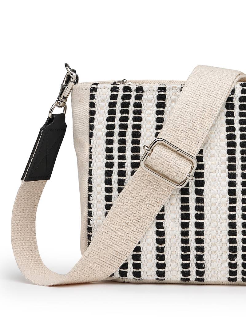 This Anekaant Sling Bag From The Earth Edit Collection Features A Single Main Compartment With A Secure Zip Closure For Everyday Convenience. Designed In A Classic Off White Base With Bold Black Woven Stripes And Subtle Beige Highlights, It Showcases A Refined Vertical Woven Pattern For A Sleek Look. Crafted From Handloom Cotton Jacquard With A Durable Polyester Lining, The Bag Includes An Inner Zip Pocket, An Outer Back Zip Pocket For Easy Access, And An Adjustable, Detachable Sling Strap. Dimensions (L × H × W): 19 × 15 × 5 Cm
