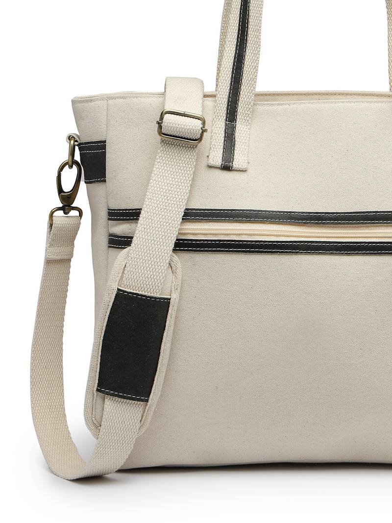 | Product Description | This Anekaant Tote Bag From The Timber & Thread Collection Is Thoughtfully Designed To Balance Everyday Functionality With Refined Style. Crafted In A Classic Off White Base, It Is Elevated With Contrasting Olive Strap Accents And A Sleek Front Zip Detail That Adds A Modern Edge To Its Solid Design. Constructed Using A Durable Blend Of Cotton Canvas And Genuine Crackle Leather, The Tote Is Finished With A Resilient Polyester Lining For Long Lasting Use. It Features A Spacious Main Compartment Secured With A Smooth Zipper Closure, Along With A Dedicated Tablet/Laptop Compartment That Fits Devices Up To 14 Inches And Fastens Securely With A Velcro Closure. Additional Storage Includes A Front Zip Pocket For Quick Access, An Inner Mobile Pocket For Essentials, And A Back Zip Pocket To Keep Valuables Safe. Designed For Versatile Carrying, The Bag Comes With Two Elegant Lace Trimmed Handles And An Adjustable, Detachable Sling Strap,Making It Suitable For Work, Travel, Or Daily Outings. Dimensions (L × H × W): 37 × 33 × 9 Cm Style : Timber & Thread Tote Bag Featuring 1 Main Compartment With A Secure Zipper Closure.
