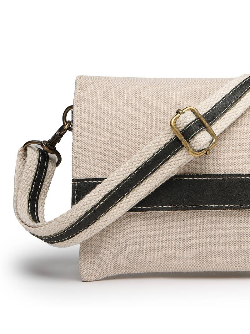 This Anekaant Sling Bag From The Timber & Thread Collection Is Thoughtfully Designed With A Single Main Compartment Secured By A Magnetic Button Closure, Offering Effortless Access While Keeping Essentials Safe. Crafted In An Off White Body, It Is Elevated With Contrasting Olive Accents On The Flap And Handle Details, Creating A Sharp And Modern Contrast. The Solid Textured Canvas Surface Is Enhanced With Clean Lines And Precise Contrast Stitching, Adding Subtle Structure To The Design. Made From A Refined Combination Of Crackle Leather And Jute Cotton, The Bag Is Finished With A Durable Polyester Lining For Everyday Reliability. Functional Features Include An Inner Slip Pocket For Essentials, An Outer Back Zip Pocket For Quick Access, And An Adjustable, Detachable Strap For Versatile Wear. Dimensions (L × H × W): 20 × 15 × 2 Cm