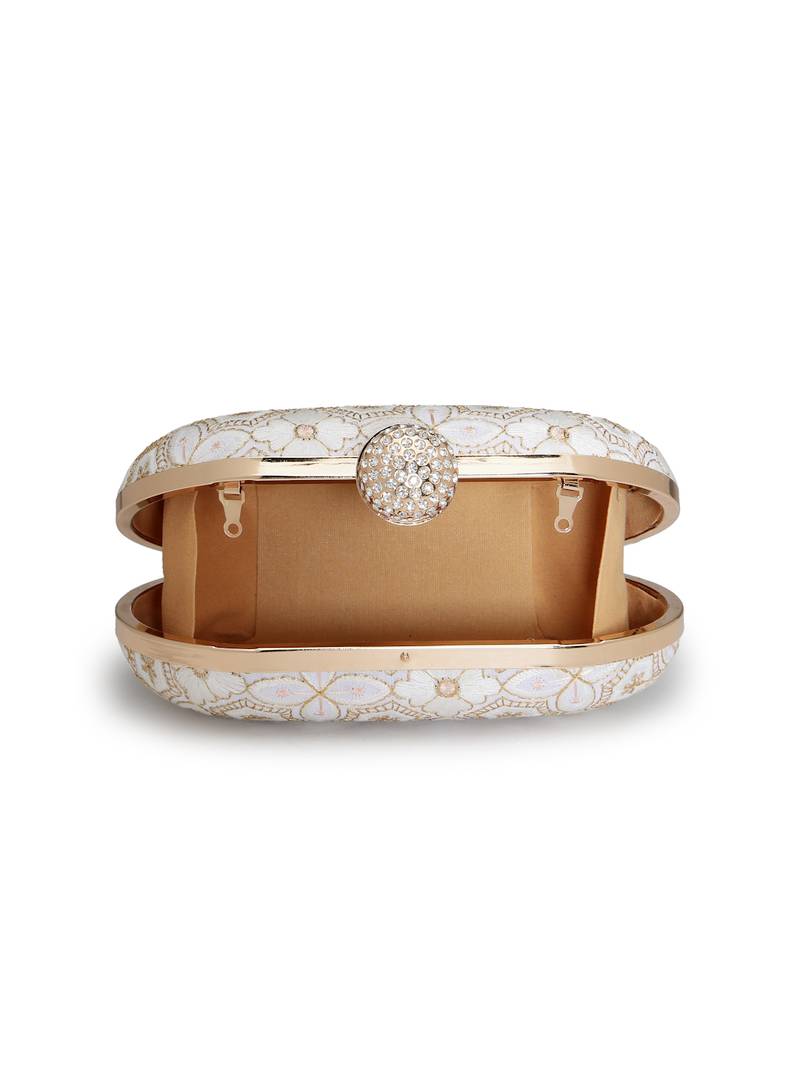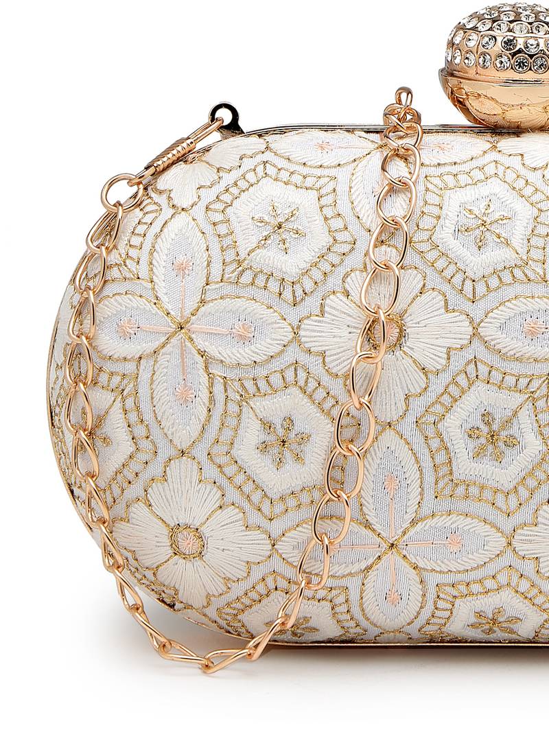 The Anekaant Clutch From The Woven Reverie Collection Is Designed With A Single Interior Compartment Secured By A Precision Click Closure, Offering A Refined Balance Of Style And Functionality. Showcased In An Elegant Off White Base, The Design Is Accented With Soft Peach And Gold Embroidery For A Subtle Yet Sophisticated Appeal. Crafted From Faux Silk And Finished With A Soft Velvet Lining, The Clutch Delivers A Smooth, Premium Feel. The Surface Features A Geometric Floral Motif, Brought To Life Through Precision Embroidery And Metallic Gold Accents For A Polished, Artisanal Finish. Completed With A Detachable Chain Strap, This Clutch Allows Versatile Styling For Party And Special Occasion Wear. Dimensions (L × H × W): 18 × 11 × 4 Cm.