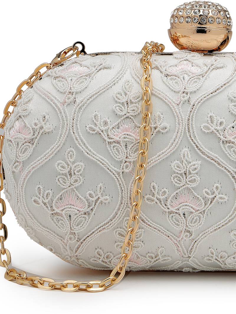 The Anekaant Clutch From The Woven Reverie Collection Is Styled With A Single Main Compartment Secured By A Reliable Click Closure, Ensuring Both Elegance And Secure Storage. Finished In A Pearl White Base, The Design Is Enhanced With Subtle Pastel Pink Embroidery For A Soft, Refined Appeal. Crafted With A Faux Silk Exterior And Finished With A Smooth Velvet Lining, The Clutch Offers A Luxurious Feel And Polished Finish. The Exterior Features Graceful Floral Vine Embroidery In Pastel Pink, Complemented By Delicate Scalloped Detailing That Adds Understated Sophistication. Equipped With A Detachable Chain Strap, This Clutch Allows Versatile Styling As A Sling Or Handheld Accessory, Making It An Ideal Choice For Wedding Wear And Special Occasions. Dimensions (L × H × W): 18 × 11 × 4 Cm.
