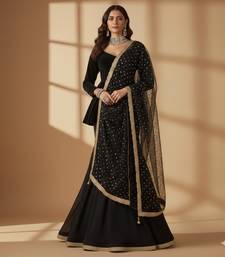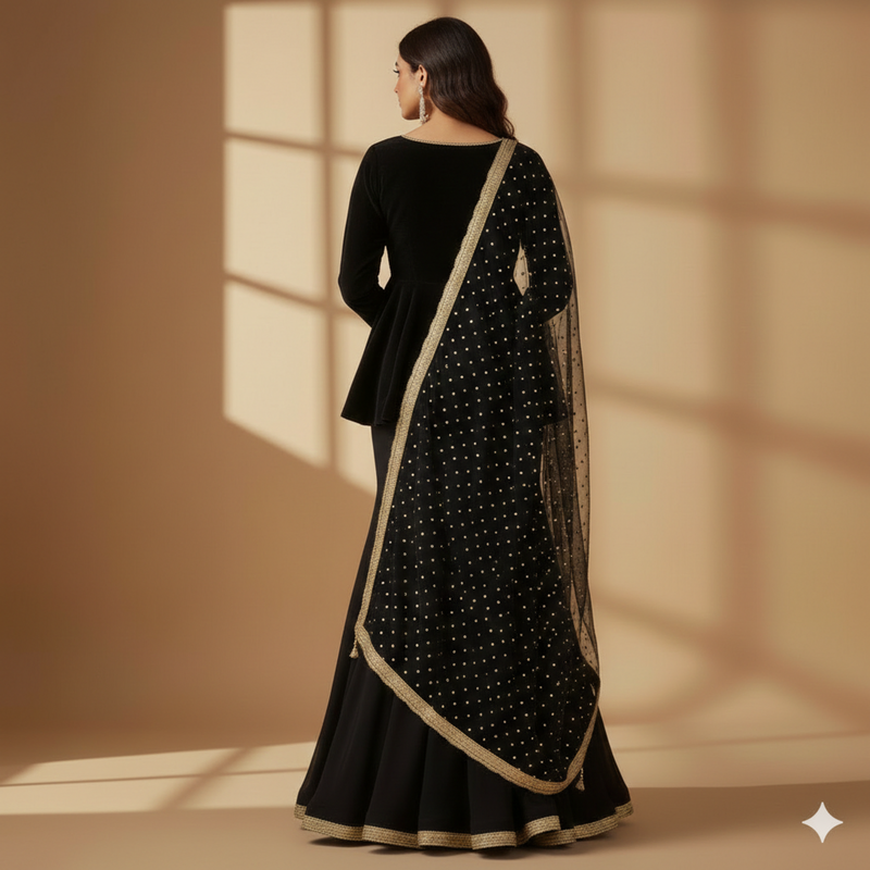 | Product Description | Black Georgette Lehenga Choli Set Designed With A Graceful Silhouette That Highlights The Beauty Of The Flowing Fabric. The Blouse Features A Structured Design That Complements The Lehenga Perfectly, Creating A Balanced And Elegant Appearance. The Georgette Lehenga Drapes Smoothly And Is Finished With Subtle Gold Border Detailing Along The Hem. The Outfit Is Paired With A Sheer Dupatta Decorated With Gold Polka Patterns And A Matching Border That Adds A Refined Touch To The Ensemble. The Lightweight Fabric Allows The Dupatta To Flow Beautifully And Enhances The Overall Look. The Classic Black Color Combined With Gold Accents Makes This Lehenga Set A Lovely Choice For Festive Celebrations, Evening Gatherings, And Special Occasions. |