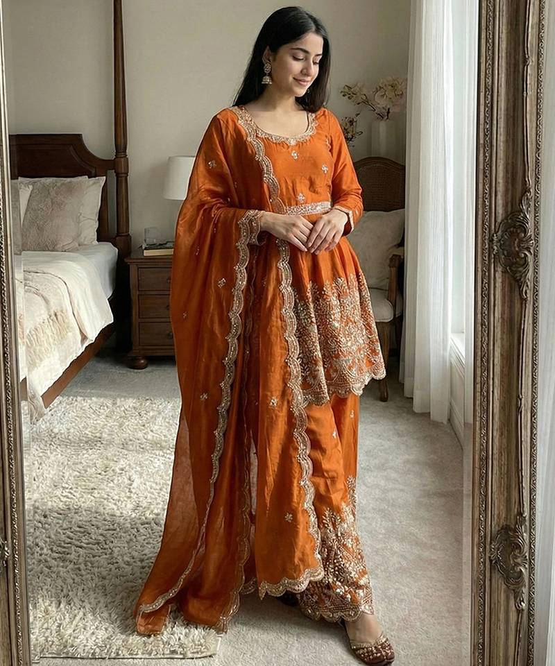 | • | Dupatta | : | Color- Orange / Fabric- Silk Blend |