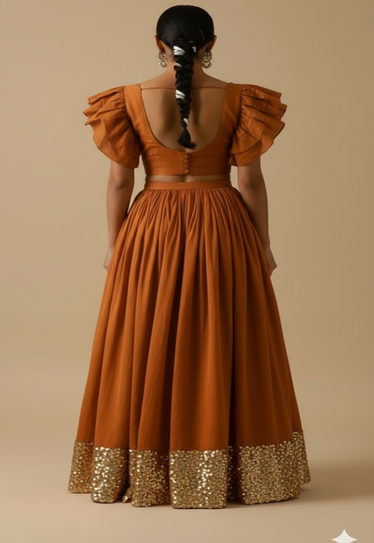 Rust orange art silk lehenga set with ruffle sleeve blouse