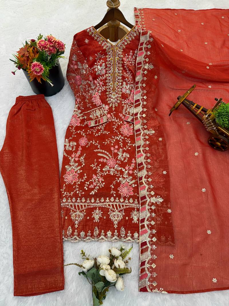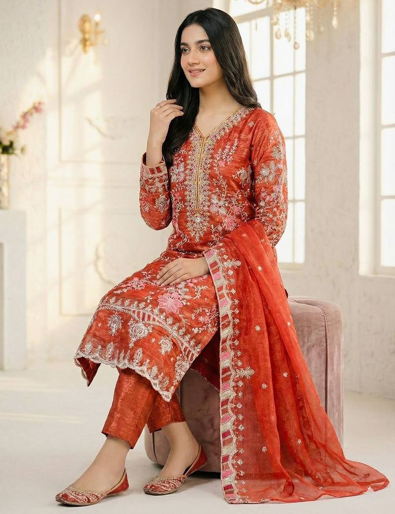 Rust orange embroidered ethnic suit stitched