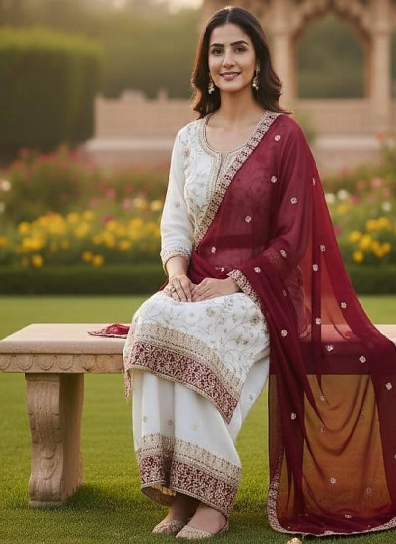 | Product Description | Graceful And Timeless, This White Kurta Sharara Set Features Delicate Gold Thread Embroidery And A Richly Bordered Maroon Dupatta. Designed With Flared Sleeves And Ornate Detailing, It Offers A Refined Festive Aesthetic. Perfect For Engagement Parties And Formal Events, It Radiates Understated Luxury. |