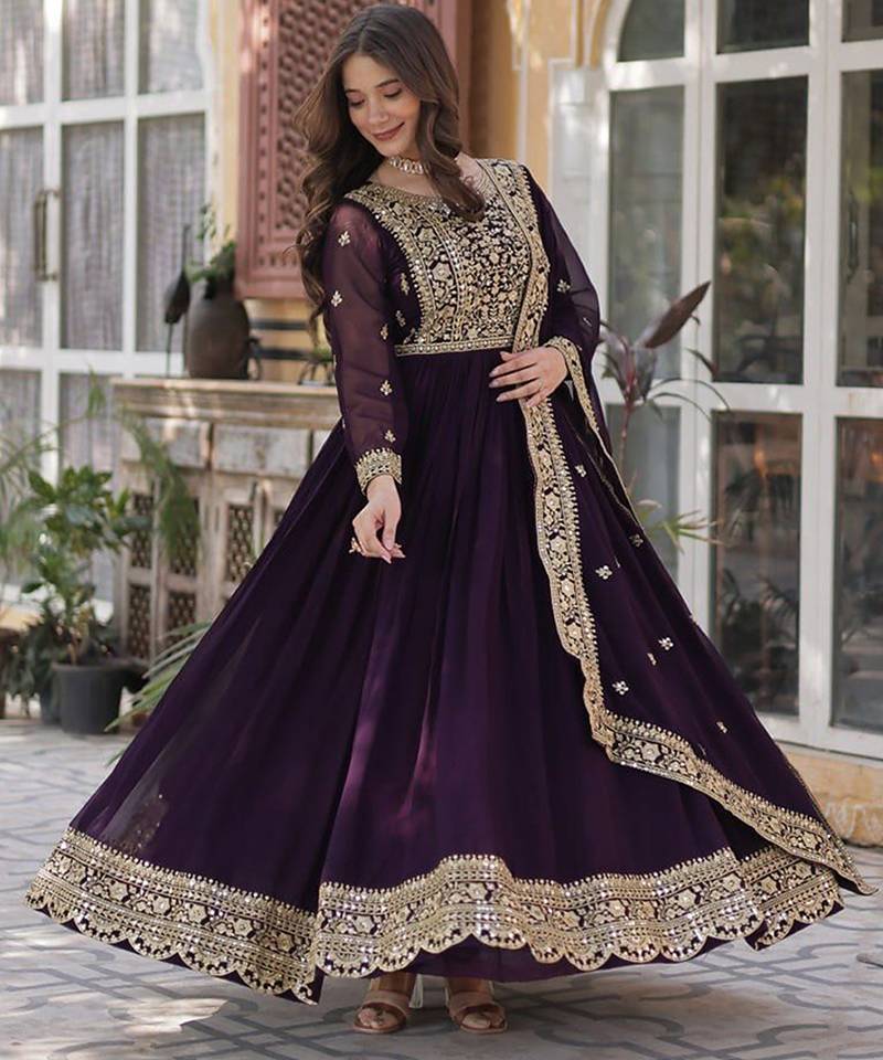 | Product Description | Exude Royal Elegance In This Breathtaking Deep Purple Anarkali Suit. Made From High Quality Flowy Georgette, This Floor Length Gown Features A Heavily Embroidered Yoke And Delicate Floral Motifs Throughout The Sleeves. The Hemline Is Adorned With A Rich, Scalloped Gold Border That Adds A Luxurious Weight To The Silhouette. Accompanied By A Coordinating Embroidered Dupatta, This Outfit Is A Must Have For Wedding Receptions And Formal Evening Galas. The Deep Plum Hue Combined With Artisanal Threadwork Creates A Flattering, Regal Aesthetic That Promises Both Comfort And High Fashion Appeal For Any Special Occasion. |