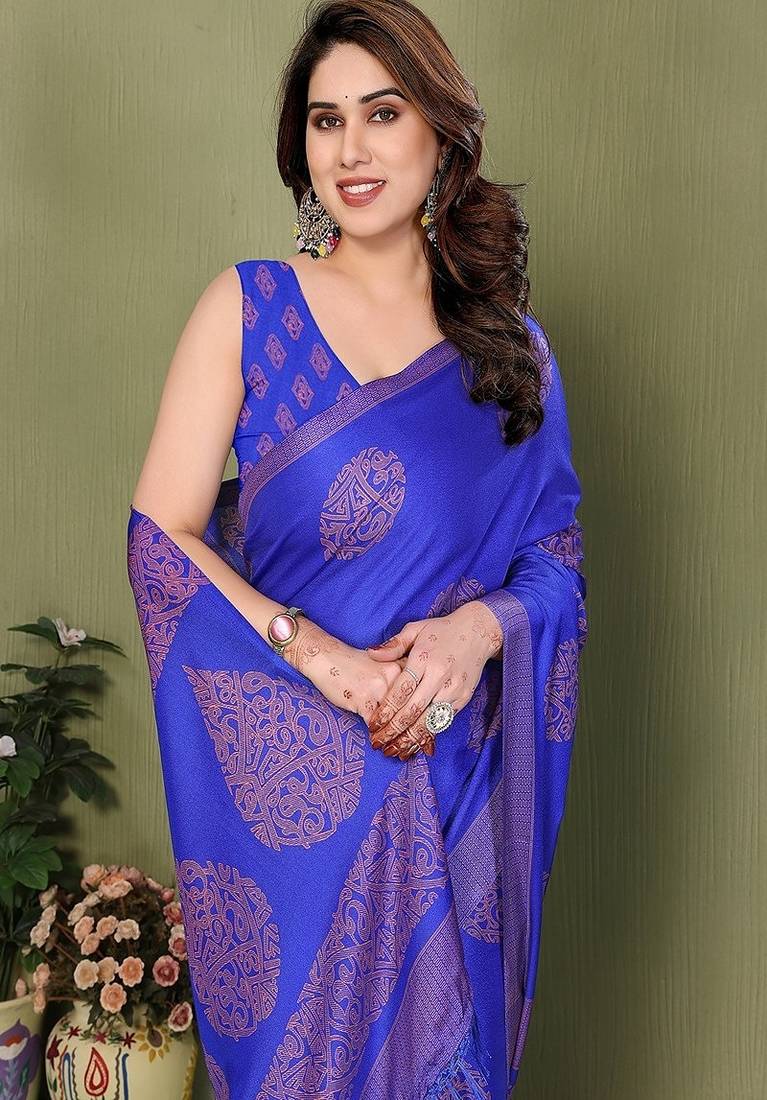 DarkRoyalBlue printed, blocked daily wear chiffon georgette saree with blouse
