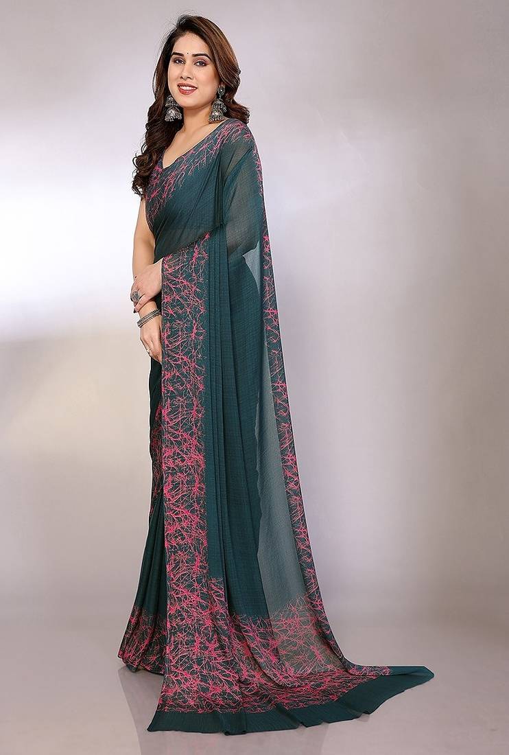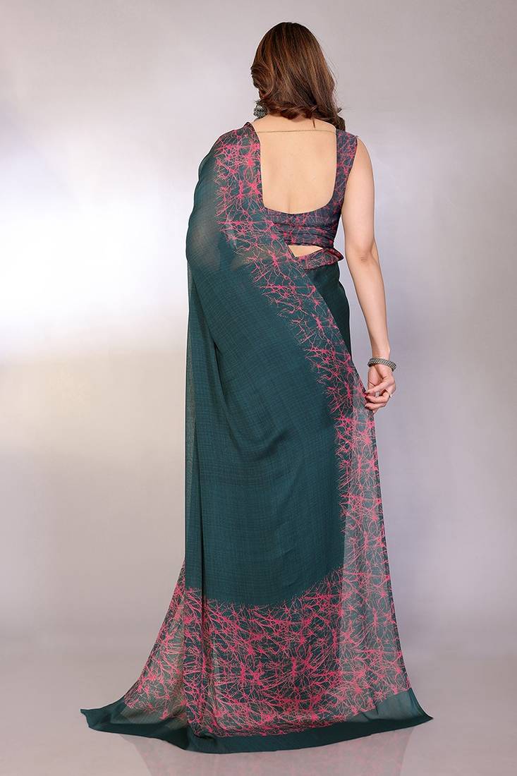 | Product Description | A Graceful Teal Green Saree Crafted In A Lightweight, Sheer Fabric That Drapes Effortlessly. Accented With A Striking Pink Abstract Print Along The Border And Pallu, It Brings A Contemporary Edge To A Classic Silhouette. The Minimal Body Balances The Bold Detailing, While The Matching Printed Blouse Completes The Look With Subtle Elegance. Perfect For Office Wear, Casual Outings, Daytime Events, Or Understated Festive Occasions, This Saree Offers A Blend Of Comfort, Modern Style, And Timeless Charm. |