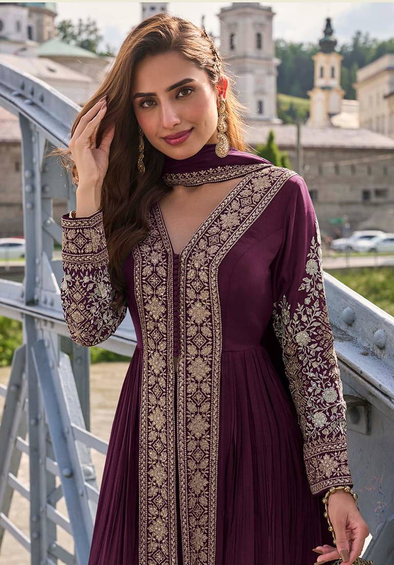 | Product Name | Wine Chinon Embroidered Salwar Suit Semi Stitched Up To 42" Size | |