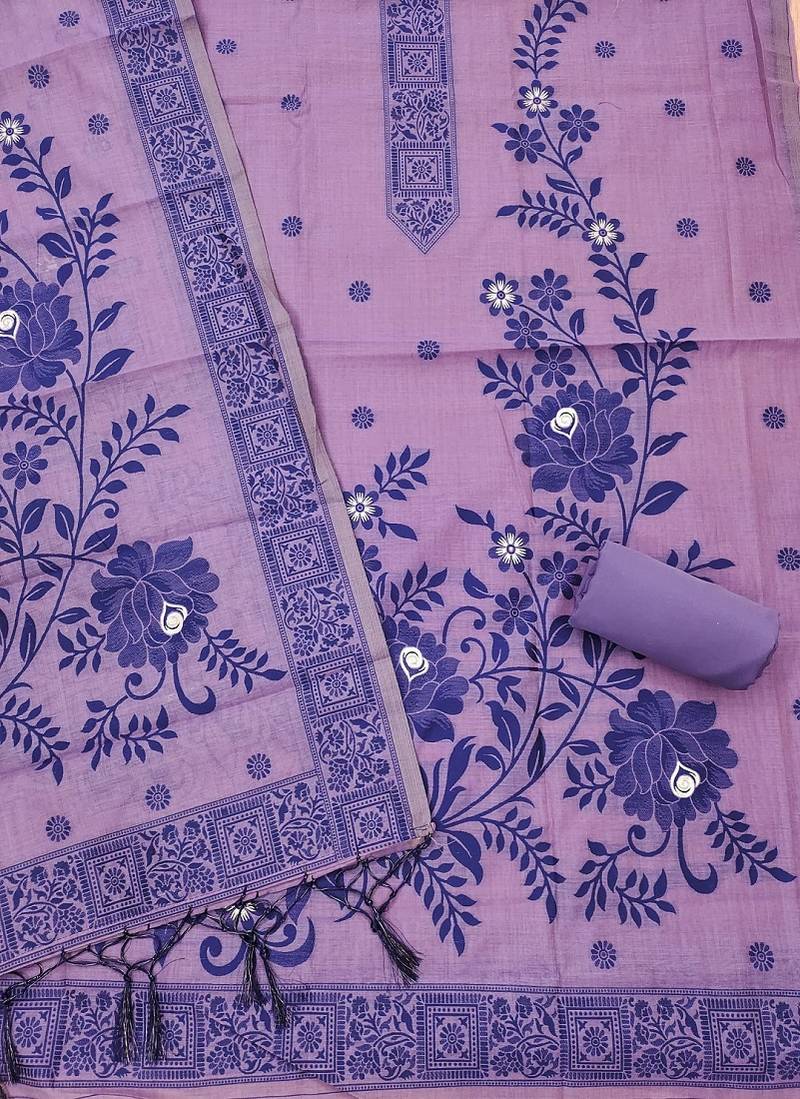 Purple muga cotton jamdani ethnic motif dress material set unstitched
