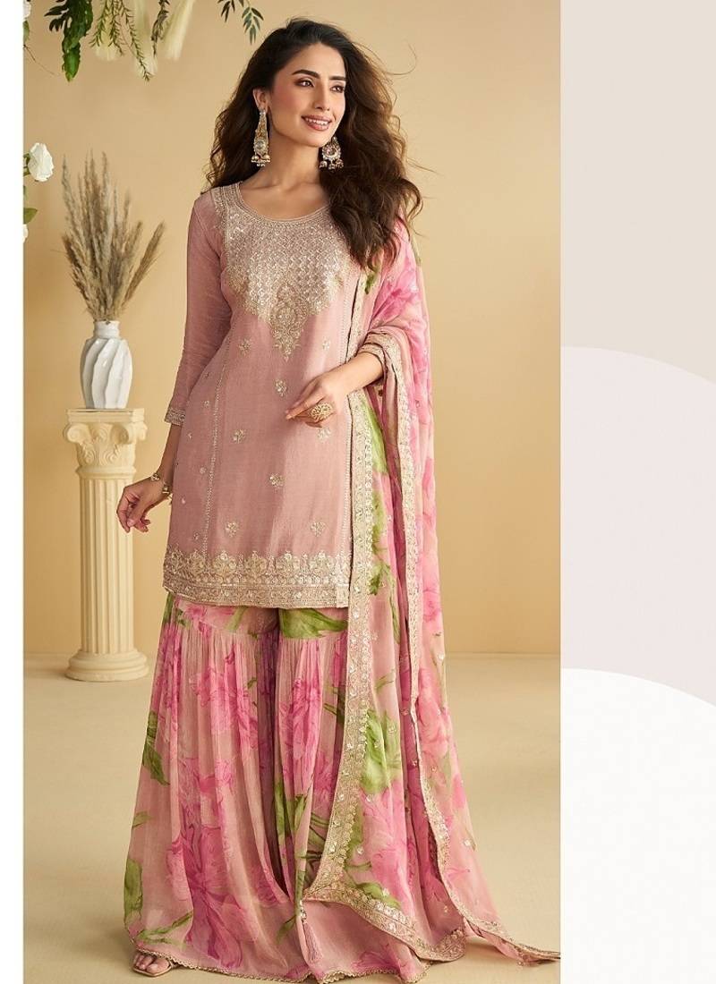 Women's pink chinon silk zari embroidered sequins sharara suit