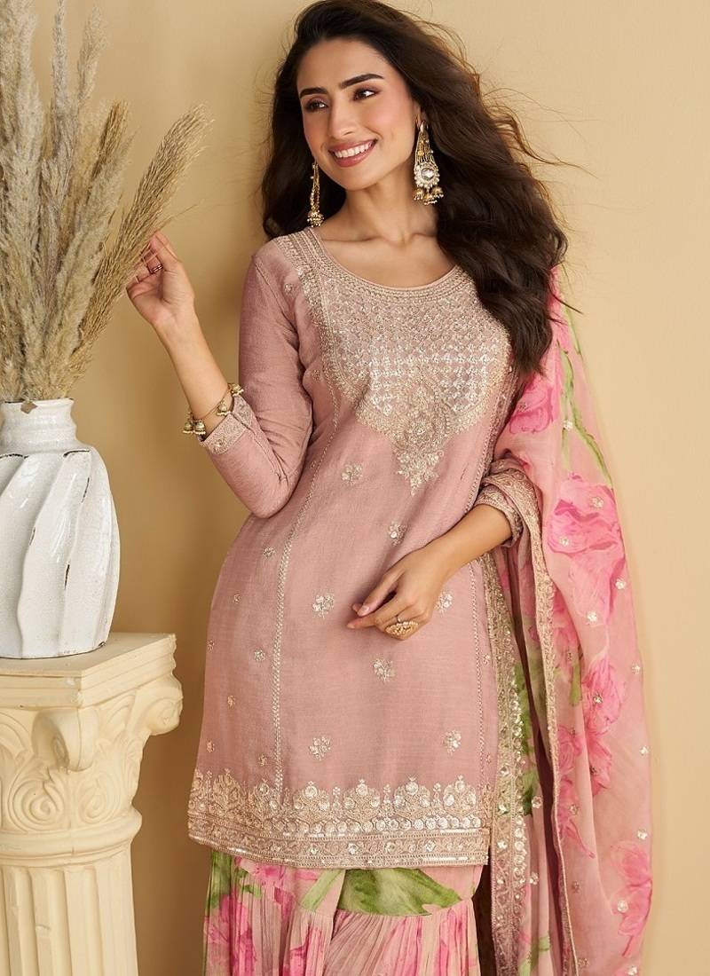 Women's pink chinon silk zari embroidered sequins sharara suit stitched