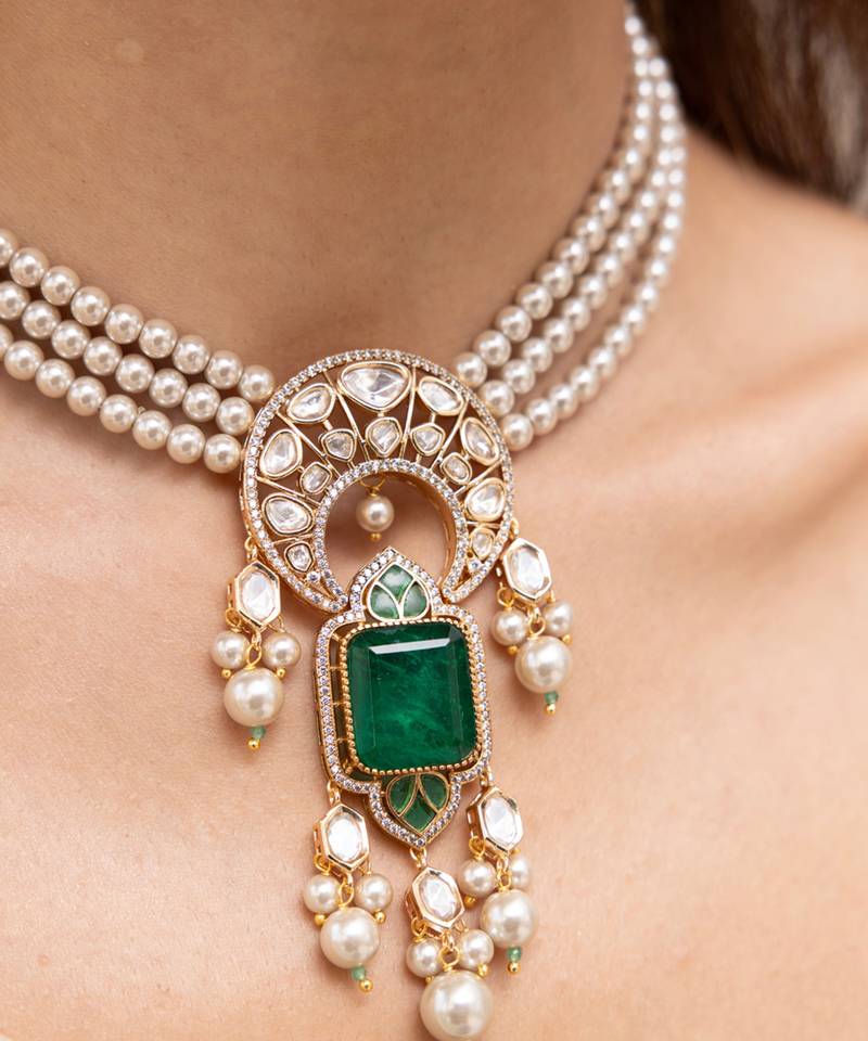 | Product Description | A Majestic Triple Layered Pearl Necklace Centered With An Ornate Green Stone And Embellished With Dangling Pearls. Inspired By Ancient Artistry, It Tells A Tale Of Devotion, Elegance, And Timeless Allure. Ideal For Wedding Rituals, Heritage Ceremonies, Or Regal Bridal Moments.