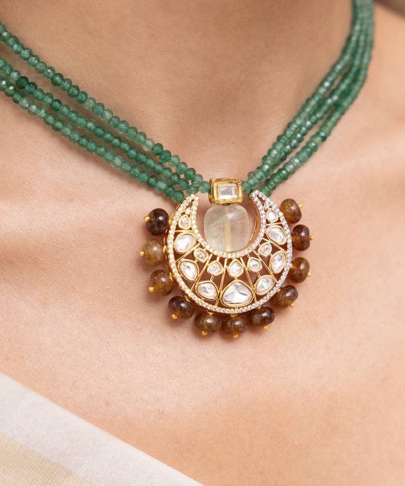 | Product Description | A Lush Green Multi Strand Choker Highlighted By A Crescent Moon Pendant In Kundan And Earthy Beads. With Its Blend Of Vibrance And Tradition, It Feels Like Folklore Worn As Jewelry. A Stunning Pick For Festive Evenings Or Fusion Functions.