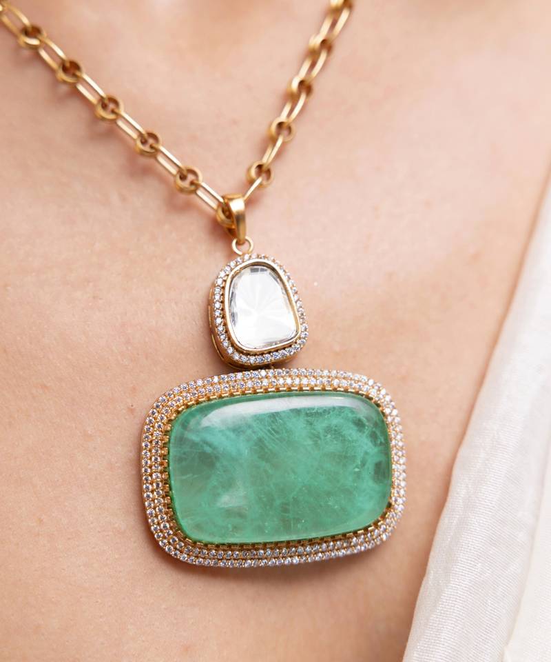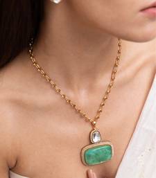 This Elegant Necklace Features A Rectangular Green Gemstone Pendant Suspended From A Delicate Beaded Chain. Understated Yet Striking, It's Perfect For Contemporary Ethnic Wear Or Light Festive Dressing.