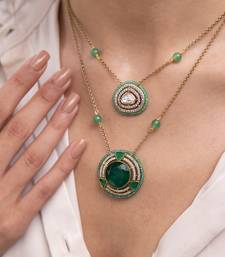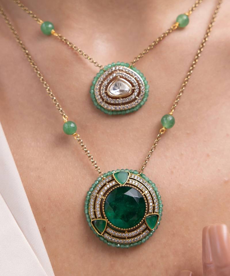 | Product Description | This Dual Pendant Necklace Features A Harmonious Play Of Emerald Greens And Mirror Detailing, Suspended On A Fine Gold Chain. Bold Yet Balanced, It's A Conversation Starter Perfect For Festive Evenings Or Curated Contemporary Looks.