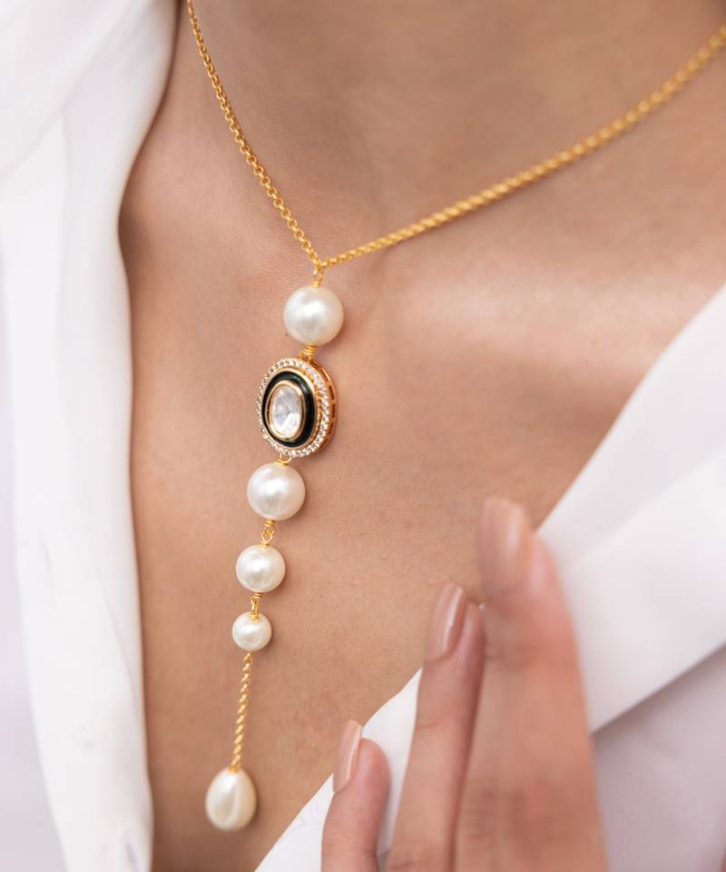 | Product Description | Refined And Linear, This Vertical Pendant Necklace Features A Sequence Of Pearl Drops Along A Delicate Gold Chain. Elegant In Structure And Versatile In Styling, It's A Graceful Pick For Formal Occasions And Modern Festive Edits.