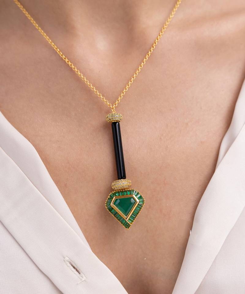 | Product Description | Bold Geometry Meets Sleek Sophistication In This Modern Necklace, Where A Black Onyx Bar Leads To A Radiant Emerald Green Pendant. Designed For The Confident Dresser, It's Ideal For Cocktail Evenings Or Gallery Openings.