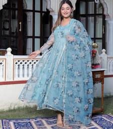 This Traditional Indian Ensemble Is A Acua Blue Floral Printed Anarkali Kurta Set With A Florel Butti Dupatta. The Attire Features A Long, Flowing Anarkali Style Kurta Deep Back Lace With A Flared Hem And A Round Neck With Detailed Trim. It Is Typically A Three Piece Set That Includes A Kurta, Matching Pants, And A Vibrant Dupatta.