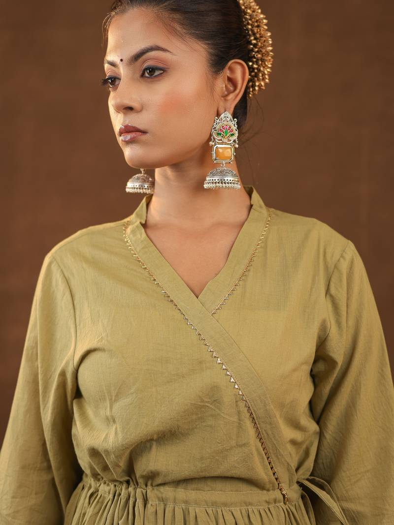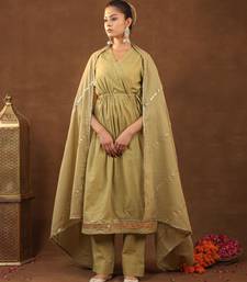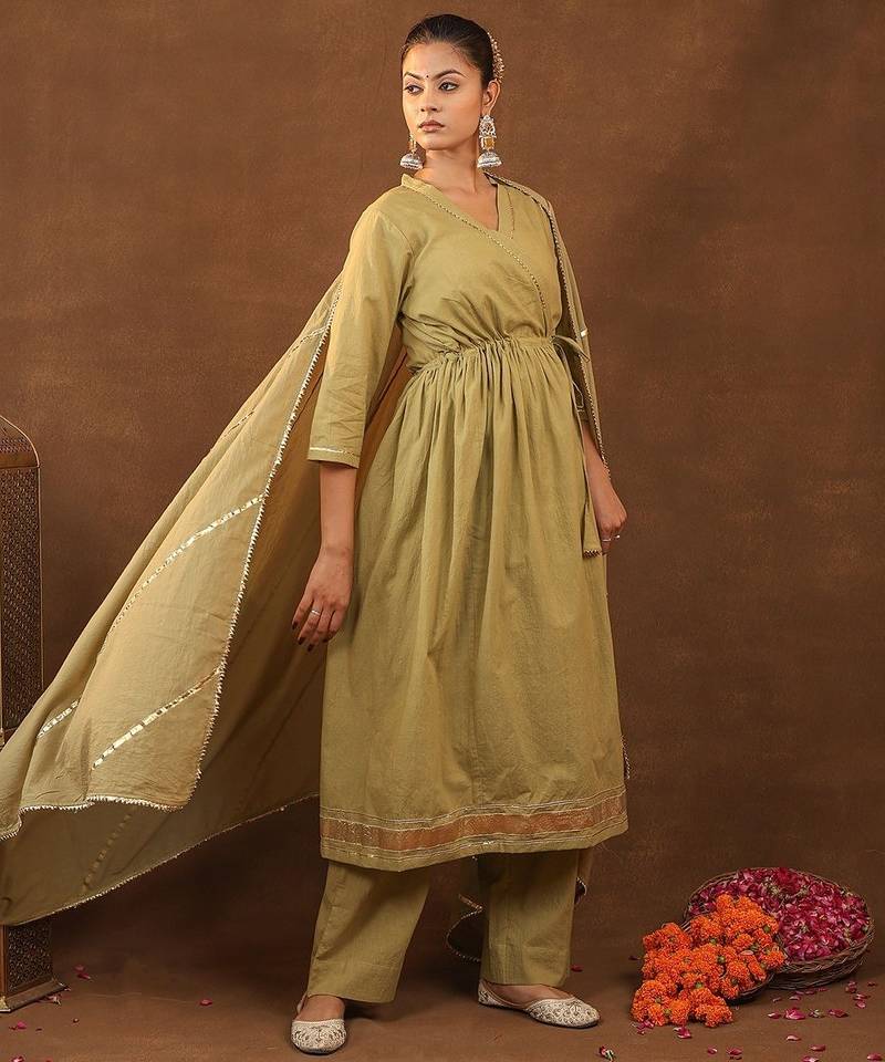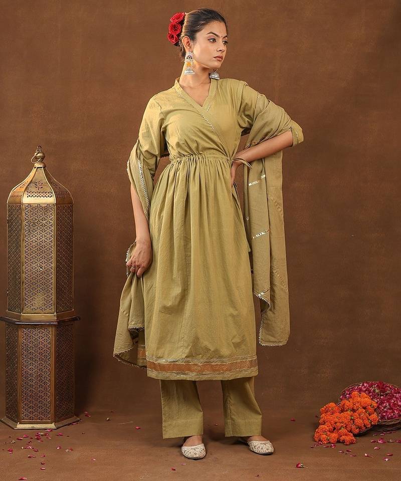 This Beautiful Ethnic Ensemble Is A Women's Embroidered Aangrakha Set With Dupatta By The Brand Kalakasuti Jaipur. . The Set Features A Solid Colored Kurta With Intricate Embroidery And Gotta Details. The Overall Look Has Traditional Gotta Work, Which Gives It A Festive Appeal. The Set In The Image Is A Rich Mahandi The Kurta Has A Straight Shape, A Round Neck, And Three Quarter Regular Sleeves, Reaching Calf Length. The Pants Features An Elasticated Waistband And Is A Slip On Closure.The Fabric Is Typically Described As Cotton Offering Comfort And A Gentle Sheen.This Type Of Outfit Is Considered Ethnic Wear Suitable For Festive Celebrations, Weddings, Family Gatherings, And Parties.