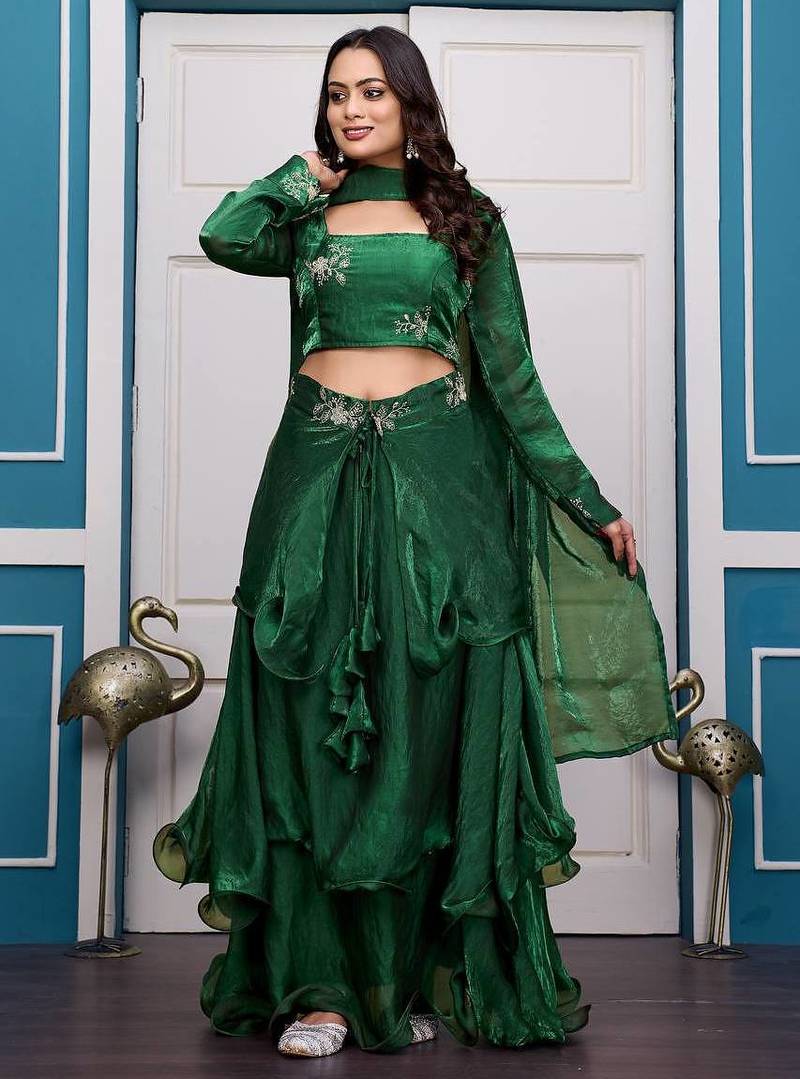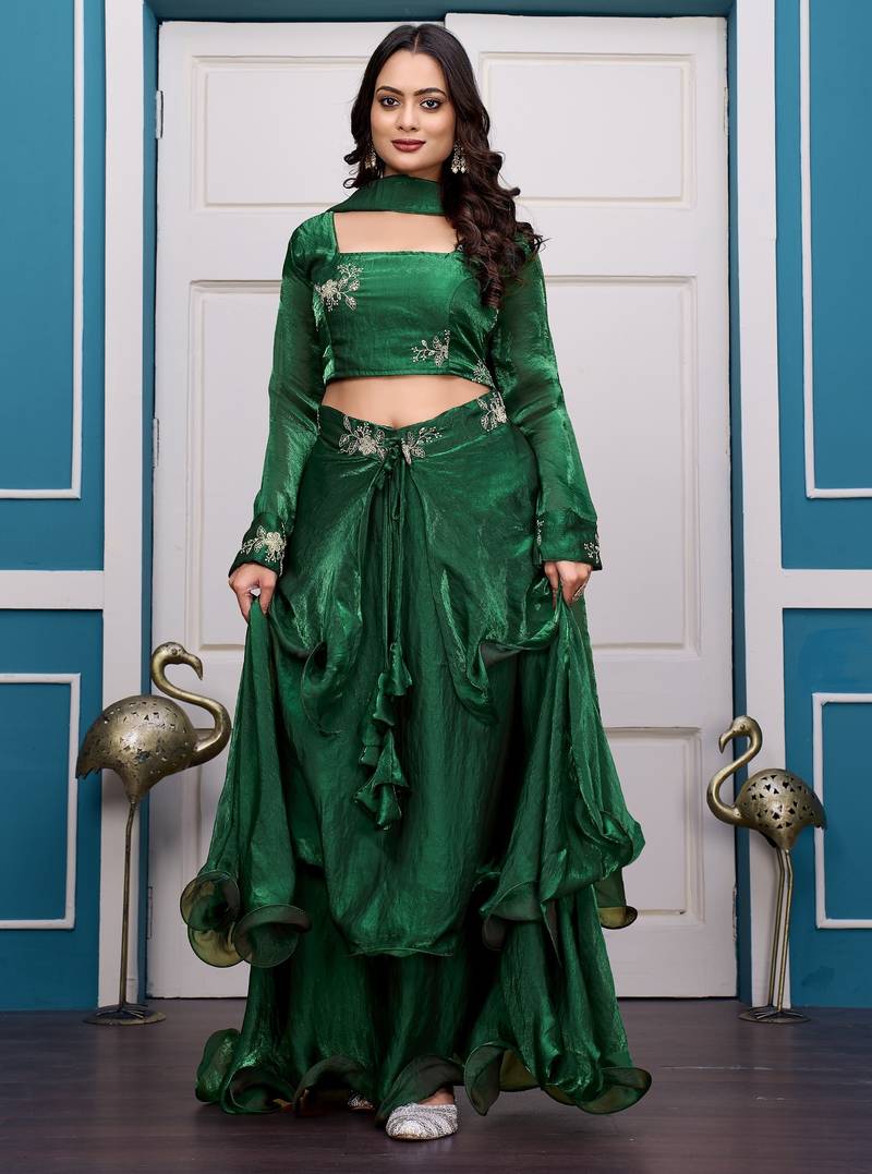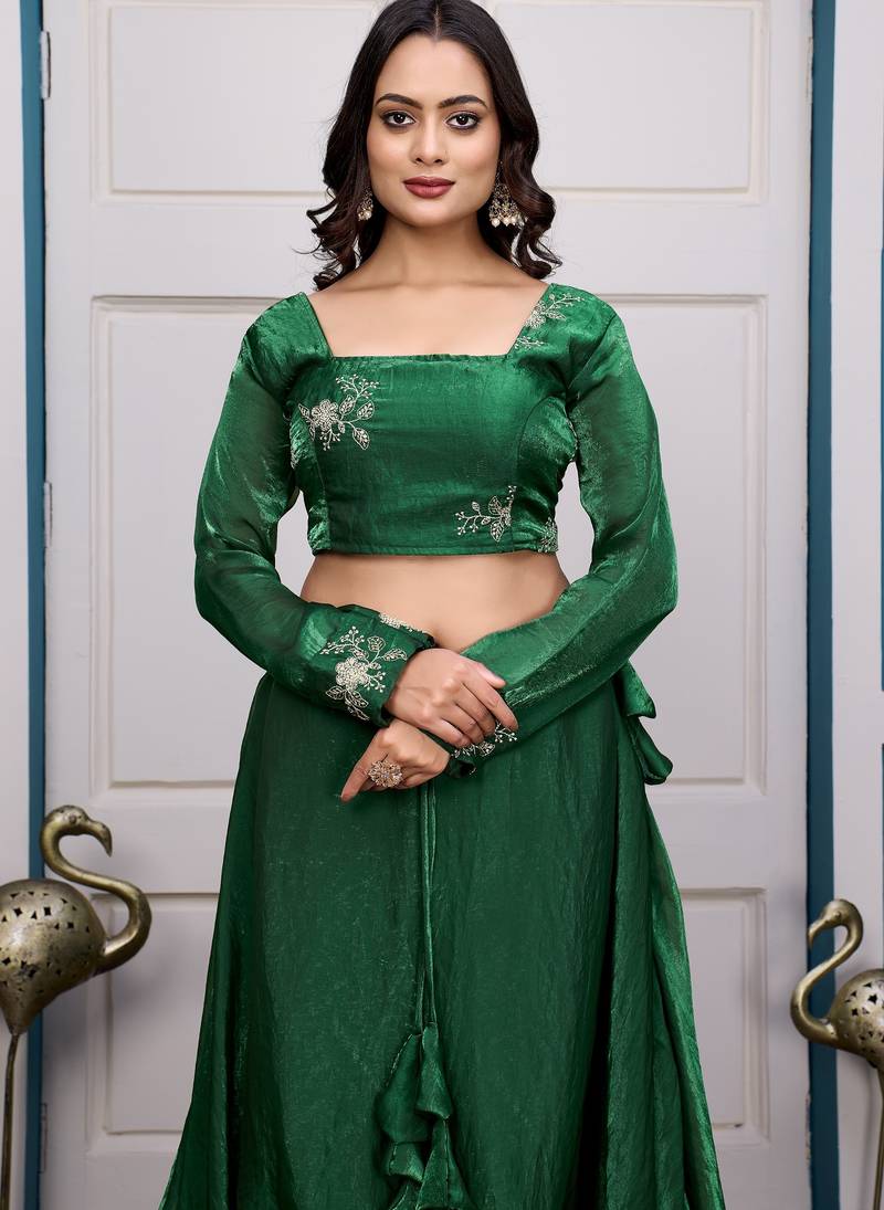 Completing The Ensemble Is A Soft Fendy Satin Dupatta Measuring 2.25 Meters That Drapes Beautifully And Enhances The Overall Elegance Of The Look. Comfortable Cotton Lining Ensures Ease Of Wear During Long Celebrations. Perfect For Weddings, Receptions, Festive Parties, And Special Occasions, This Green Lehenga Set Pairs Beautifully With Statement Jewelry. Shop Now To Elevate Your Festive Wardrobe With Timeless Elegance.