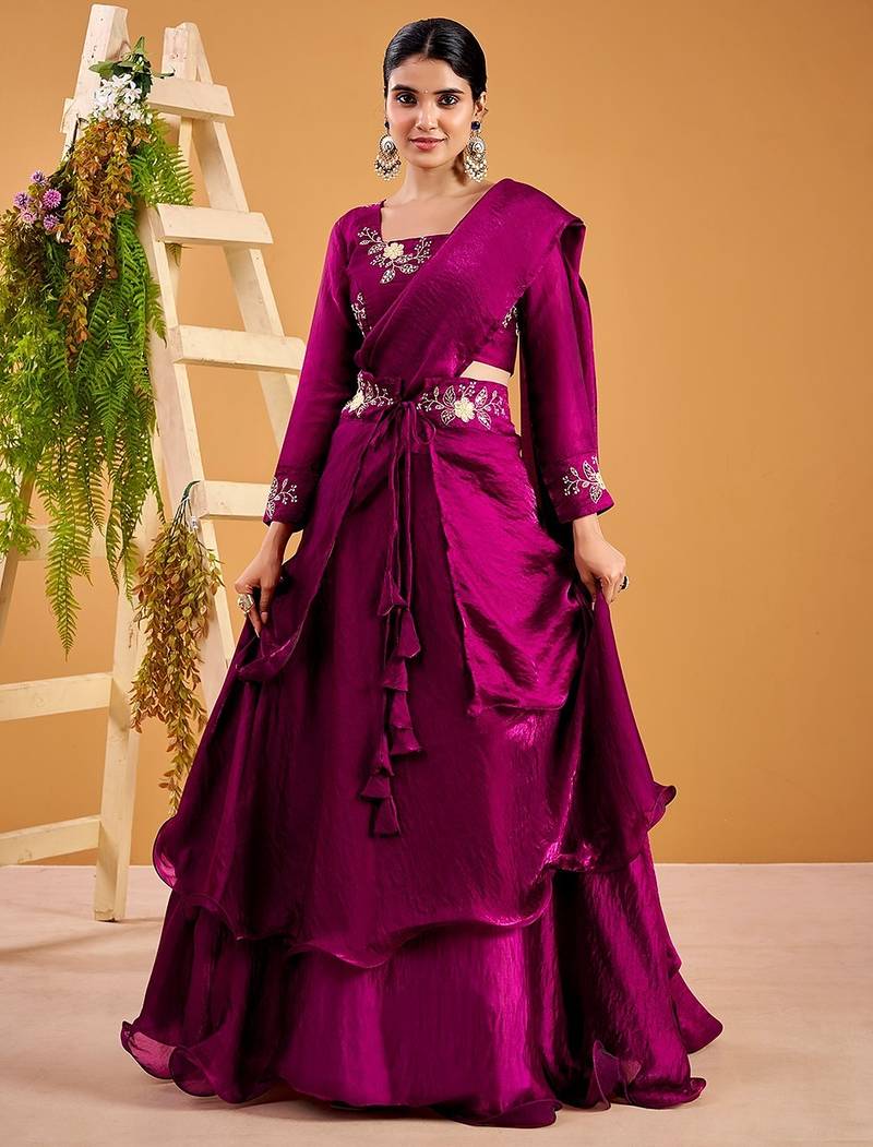 Lehenga Set In Rich Wine Fendy Satin Showcases A Perfect Balance Of Elegance And Festive Glamour. Designed With A Beautifully Flared Silhouette, The Lehenga Features Delicate Embroidery And Shimmering Sequins Work That Adds A Luxurious Touch To The Outfit. The Smooth Satin Texture Gives The Ensemble A Graceful Shine, Making It Ideal For Special Celebrations.