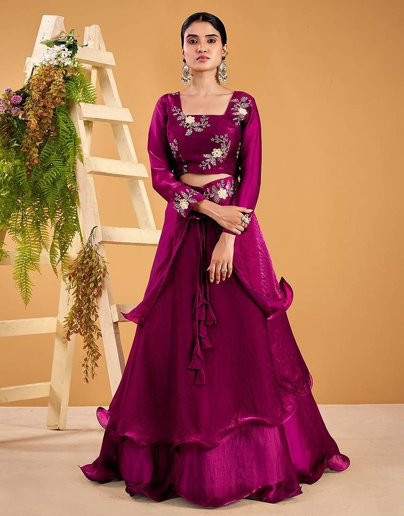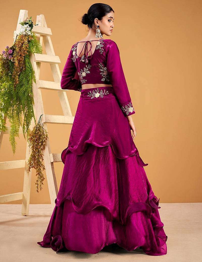 Wine Fendy Satin Embroidered Lehenga Set With Dupatta